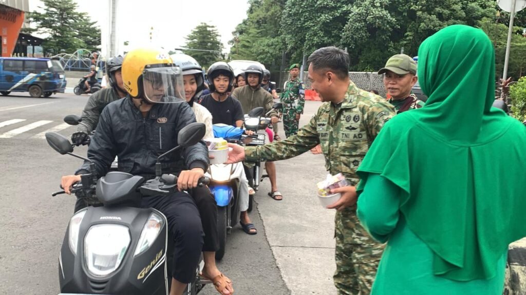 Sumedang –Lensadeteksi.my.id. Semangat berbagi dan kepedulian sosial mewarnai suasana sore di kawasan Bunderan Binokasih, Jumat (27/02/2026). Komandan Kodim 0610/Sumedang Letkol Arh. Kusuma Ardianto S.I.P., M. Han bersama ibu-ibu Persit Kartika Chandra Kirana Cabang XXI Kodim 0610/Sumedang turun langsung membagikan takjil kepada masyarakat dan para pengguna jalan yang melintas.