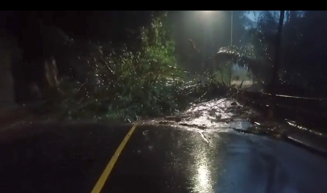 Material longsoran serta pohon bambu dan pohon aren yang tumbang menutup badan jalan, sehingga arus lalu lintas tidak dapat dilalui kendaraan baik roda dua maupun roda empat.